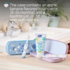 - Kutu, elma muz aromalı bir diş macunu (6-24 ay) ve yumuşak kıllara sahip bir diş fırçası (6-36 ay) içermektedir.